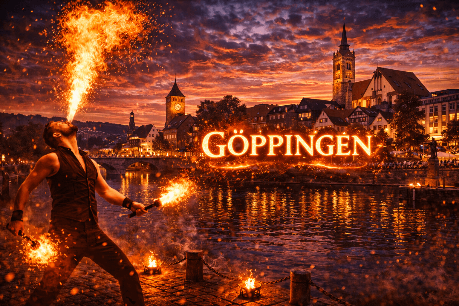 Göppingen im Filstal bietet mit seiner lebendigen Innenstadt, den umliegenden Orten und zahlreichen Veranstaltungsflächen ideale Voraussetzungen für besondere Events. Zwischen Marktplatz, Hohenstaufenregion und modernen Eventlocations finden jedes Jahr Hochzeiten, Firmenfeiern, Stadtfeste und private Veranstaltungen statt. Wenn Sie eine Feuershow in Göppingen buchen oder professionelle Feuerkünstler buchen in Göppingen möchten, sind Sie bei uns genau richtig.
