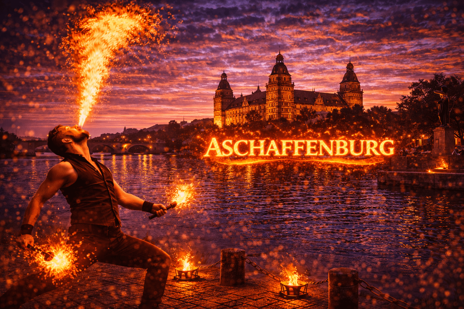 Aschaffenburg wird nicht ohne Grund das „bayerische Nizza“ genannt. Die Stadt am Main verbindet historische Architektur, Parkanlagen und moderne Eventlocations zu einem idealen Ort für besondere Veranstaltungen. Zwischen Schloss Johannisburg, Mainufer und Altstadt finden jedes Jahr zahlreiche Hochzeiten, Firmenfeiern, Sommerfeste und private Events statt. Wenn Sie eine Feuershow in Aschaffenburg buchen oder professionelle Feuerkünstler buchen in Aschaffenburg möchten, sind Sie bei uns genau richtig.