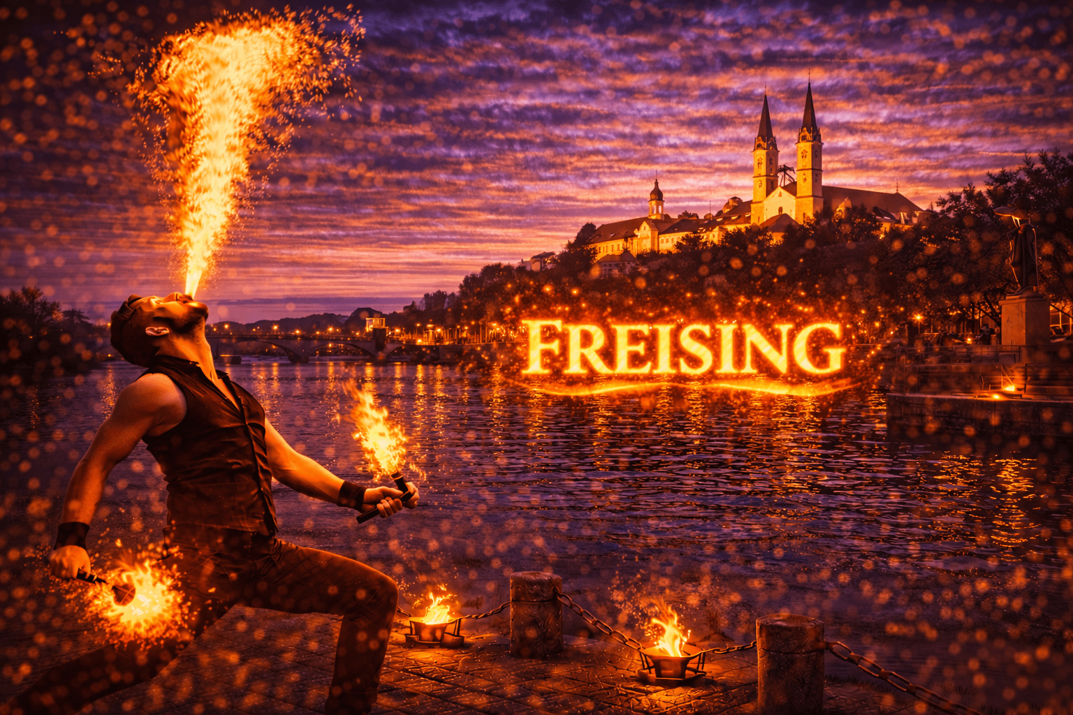 Freising zählt zu den beliebtesten Veranstaltungsorten im Münchner Umland. Die historische Altstadt, der Domberg und zahlreiche stilvolle Eventlocations machen die Stadt zu einem idealen Ort für besondere Feiern. Zwischen Altstadtgassen, Weihenstephaner Berg und den umliegenden Veranstaltungsflächen finden jedes Jahr Hochzeiten, Firmenfeiern, Sommerfeste und private Events statt. Wenn Sie eine Feuershow in Freising buchen oder professionelle Feuerkünstler buchen in Freising möchten, sind Sie bei uns genau richtig.