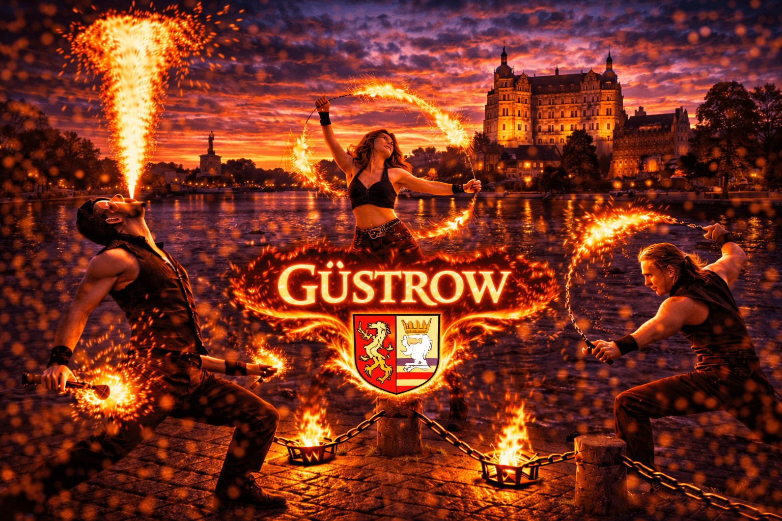 Güstrow gehört zu den traditionsreichen Städten Mecklenburg-Vorpommerns und beeindruckt mit seiner historischen Altstadt, dem Schloss Güstrow und einer lebendigen Kulturszene. Die Stadt bietet mit ihren Plätzen, Parks und Veranstaltungsorten eine ideale Kulisse für besondere Events. Zwischen Marktplatz, Schlosspark und verschiedenen Eventlocations finden jedes Jahr Hochzeiten, Firmenfeiern, Stadtfeste und private Veranstaltungen statt. Wenn Sie eine Feuershow in Güstrow buchen oder professionelle Feuerkünstler buchen in Güstrow möchten, sind Sie bei uns genau richtig.