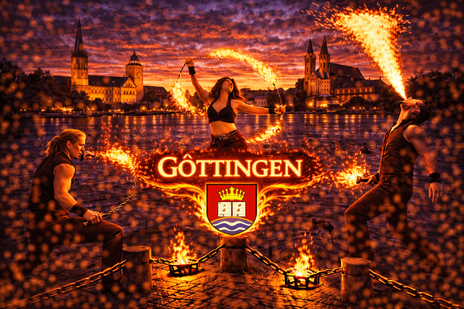 Göttingen gehört zu den bekanntesten Universitätsstädten Deutschlands und liegt im Süden Niedersachsens. Die historische Altstadt, zahlreiche kulturelle Veranstaltungen und die lebendige Studentenszene machen die Stadt zu einem beliebten Ort für Events aller Art. Zwischen Marktplatz, Wallanlagen und verschiedenen Eventlocations finden jedes Jahr Hochzeiten, Firmenfeiern, Stadtfeste und private Veranstaltungen statt. Wenn Sie eine Feuershow in Göttingen buchen oder professionelle Feuerkünstler buchen in Göttingen möchten, sind Sie bei uns genau richtig.