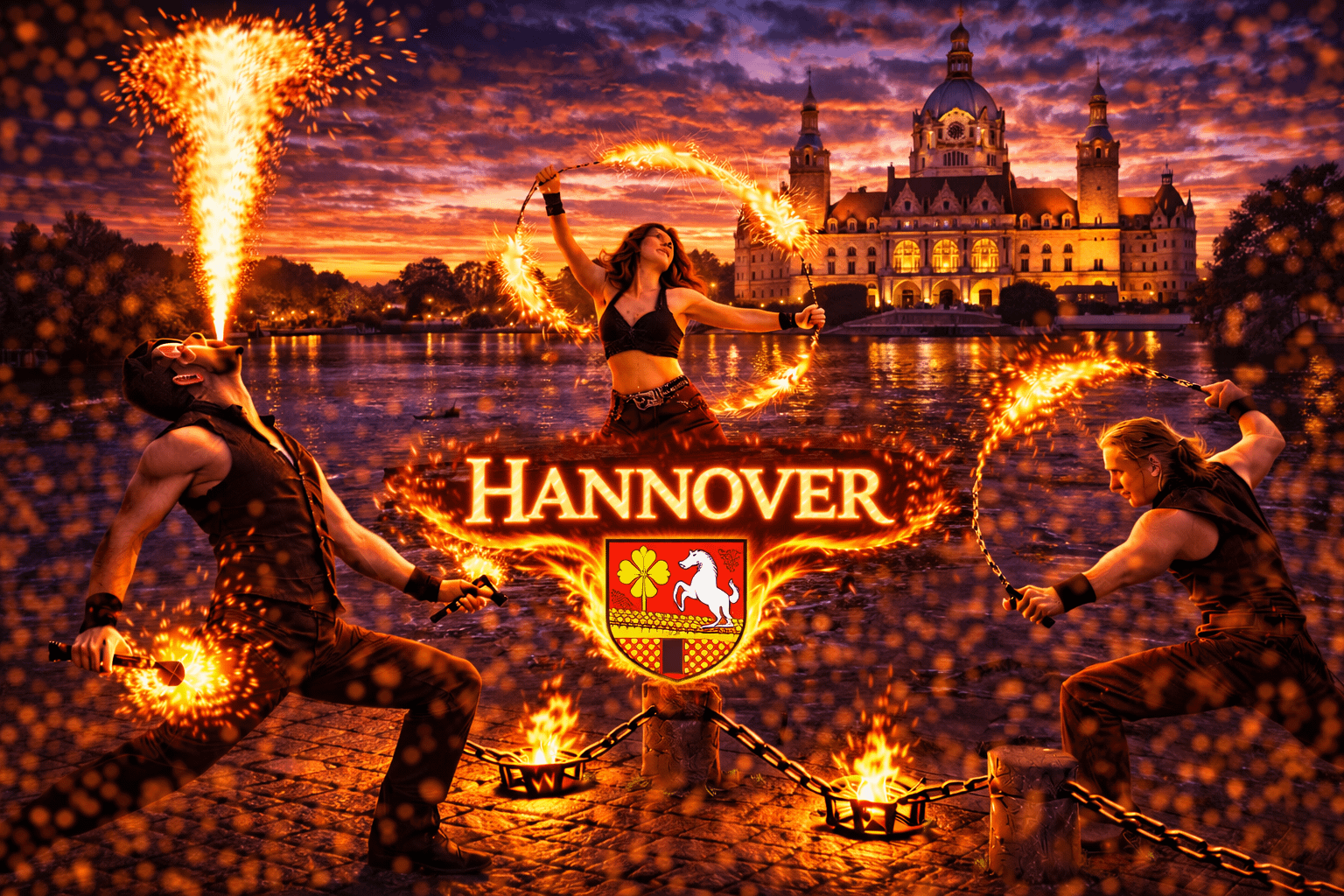 Hannover ist die Landeshauptstadt Niedersachsens und zählt zu den wichtigsten Event- und Messestädten Deutschlands. Mit der historischen Altstadt, den Herrenhäuser Gärten, zahlreichen Eventlocations und dem weltweit bekannten Messegelände bietet Hannover eine ideale Kulisse für Veranstaltungen jeder Größe. Zwischen Maschsee, Innenstadt und großen Eventhallen finden jedes Jahr Hochzeiten, Firmenfeiern, Stadtfeste und private Veranstaltungen statt. Wenn Sie eine Feuershow in Hannover buchen oder professionelle Feuerkünstler buchen in Hannover möchten, sind Sie bei uns genau richtig.