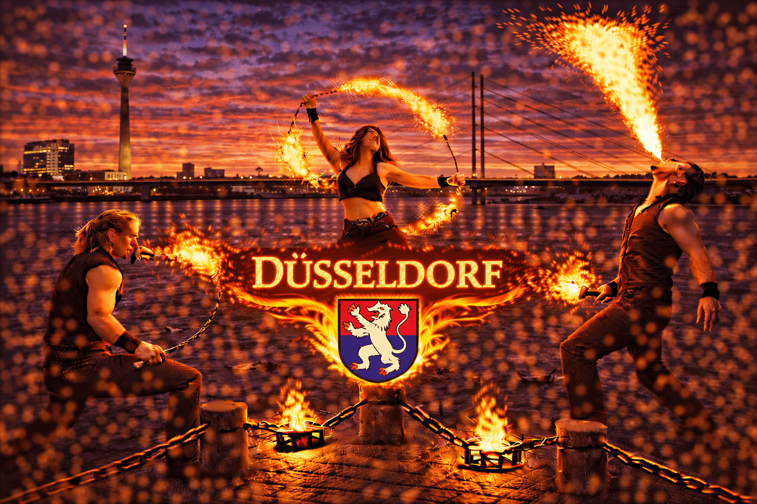 Düsseldorf gehört zu den bedeutendsten Wirtschafts- und Eventstädten Deutschlands. Die Landeshauptstadt von Nordrhein-Westfalen ist international bekannt für ihre elegante Königsallee, die moderne Rheinpromenade, zahlreiche Messen und eine lebendige Kulturszene. Zwischen Altstadt, MedienHafen und zahlreichen Eventlocations finden jedes Jahr Hochzeiten, Firmenfeiern, Gala-Veranstaltungen und private Events statt. Wenn Sie eine Feuershow in Düsseldorf buchen oder professionelle Feuerkünstler buchen in Düsseldorf möchten, sind Sie bei uns genau richtig.