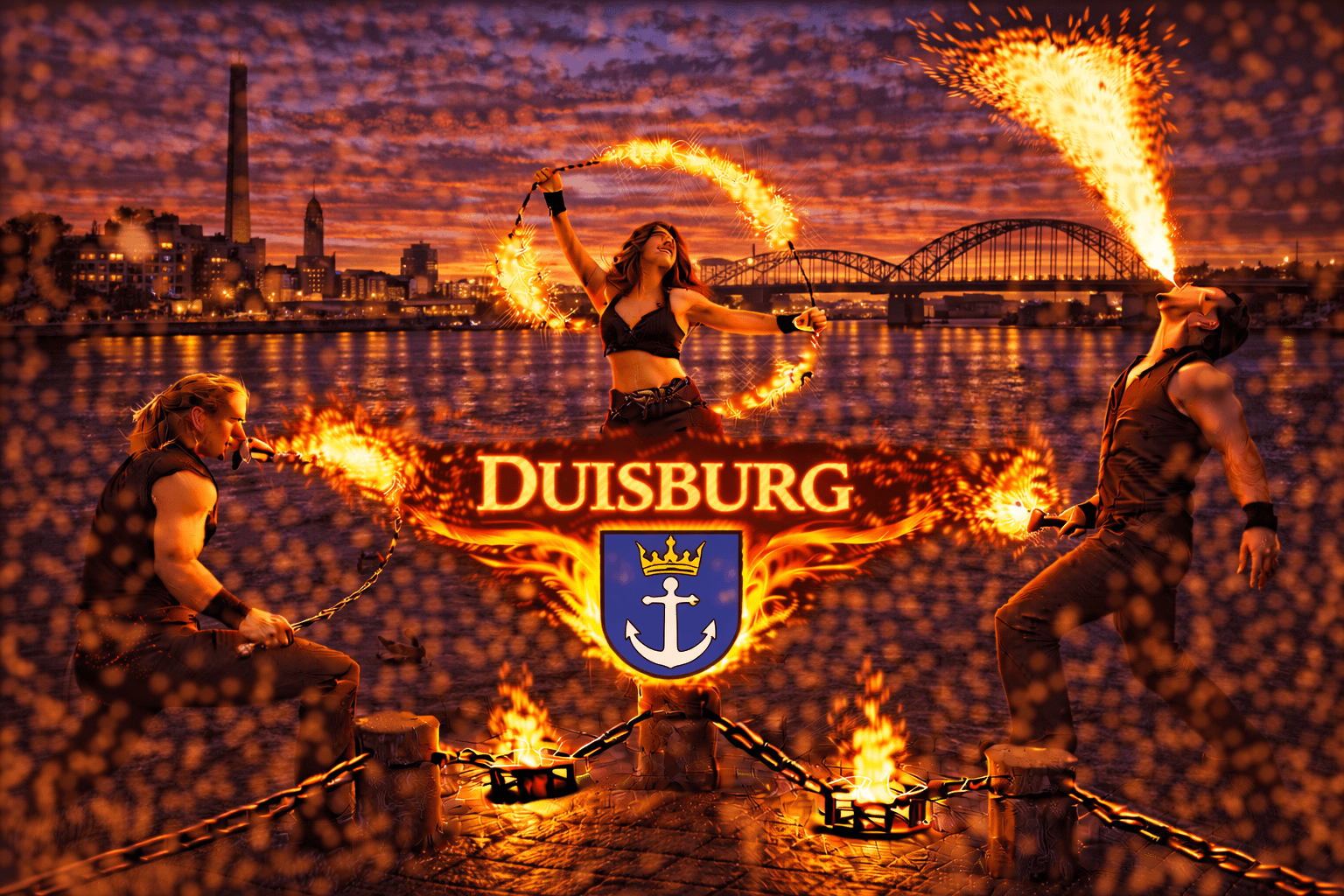 Duisburg gehört zu den größten Städten Nordrhein-Westfalens und liegt im Herzen des Ruhrgebiets. Die Stadt ist bekannt für ihren weltweit größten Binnenhafen, beeindruckende Industriekulissen und zahlreiche Veranstaltungsorte. Besonders der Landschaftspark Duisburg-Nord, die Rheinpromenade und moderne Eventlocations bieten eine spektakuläre Kulisse für Events jeder Art. Zwischen Innenstadt, Rhein und vielen Veranstaltungsflächen finden jedes Jahr Hochzeiten, Firmenfeiern, Stadtfeste und private Veranstaltungen statt. Wenn Sie eine Feuershow in Duisburg buchen oder professionelle Feuerkünstler buchen in Duisburg möchten, sind Sie bei uns genau richtig.