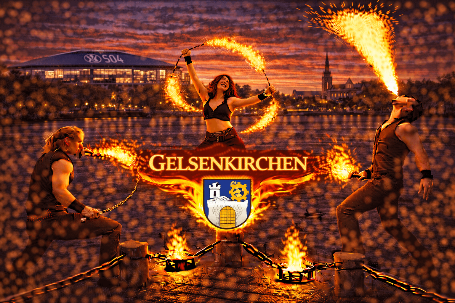 Gelsenkirchen gehört zu den bedeutenden Städten im Ruhrgebiet und ist vor allem für seine Industriekultur, große Veranstaltungsorte und den traditionsreichen Fußballverein Schalke 04 bekannt. Die Stadt verbindet historische Industriekulissen mit modernen Eventlocations und bietet damit eine außergewöhnliche Atmosphäre für Veranstaltungen aller Art. Zwischen Innenstadt, Nordsternpark und zahlreichen Eventflächen finden jedes Jahr Hochzeiten, Firmenfeiern, Stadtfeste und private Veranstaltungen statt. Wenn Sie eine Feuershow in Gelsenkirchen buchen oder professionelle Feuerkünstler buchen in Gelsenkirchen möchten, sind Sie bei uns genau richtig.