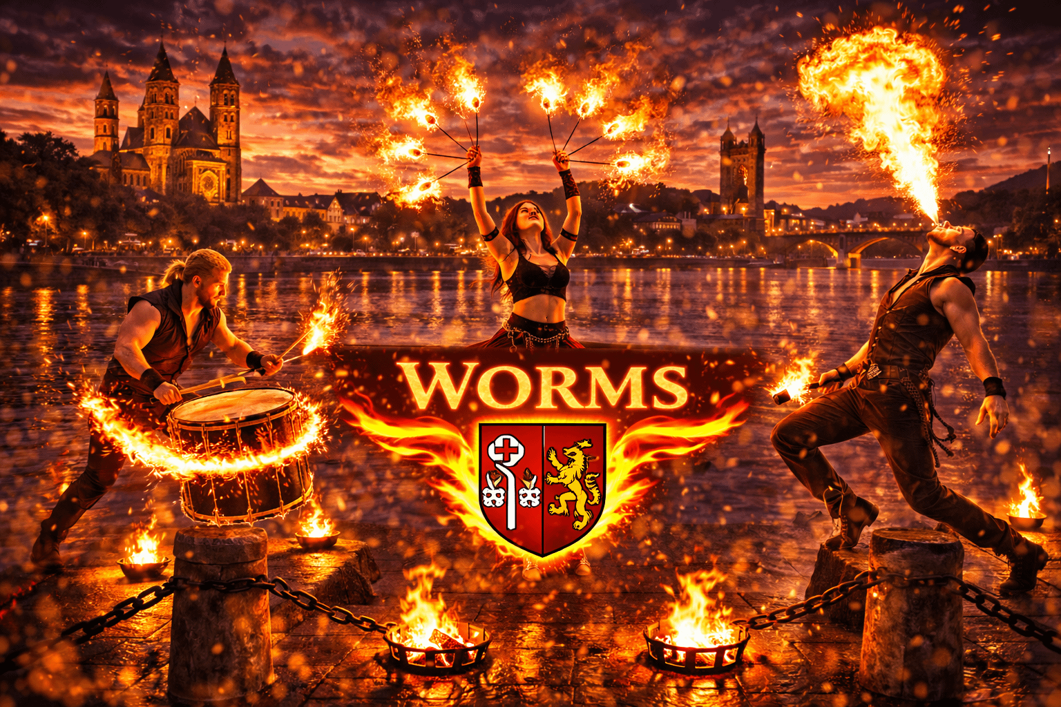 Worms gehört zu den ältesten Städten Deutschlands und blickt auf eine über 2000-jährige Geschichte zurück. Die Stadt am Rhein ist besonders bekannt für den imposanten Wormser Dom, die Nibelungensage und zahlreiche kulturelle Veranstaltungen. Mit ihrer historischen Altstadt, modernen Eventlocations und vielfältigen Veranstaltungsorten bietet Worms ideale Voraussetzungen für besondere Events. Zwischen Domplatz, Rheinpromenade und vielen Veranstaltungsflächen finden jedes Jahr Hochzeiten, Firmenfeiern, Stadtfeste und private Veranstaltungen statt. Wenn Sie eine Feuershow in Worms buchen oder professionelle Feuerkünstler buchen in Worms möchten, sind Sie bei uns genau richtig.