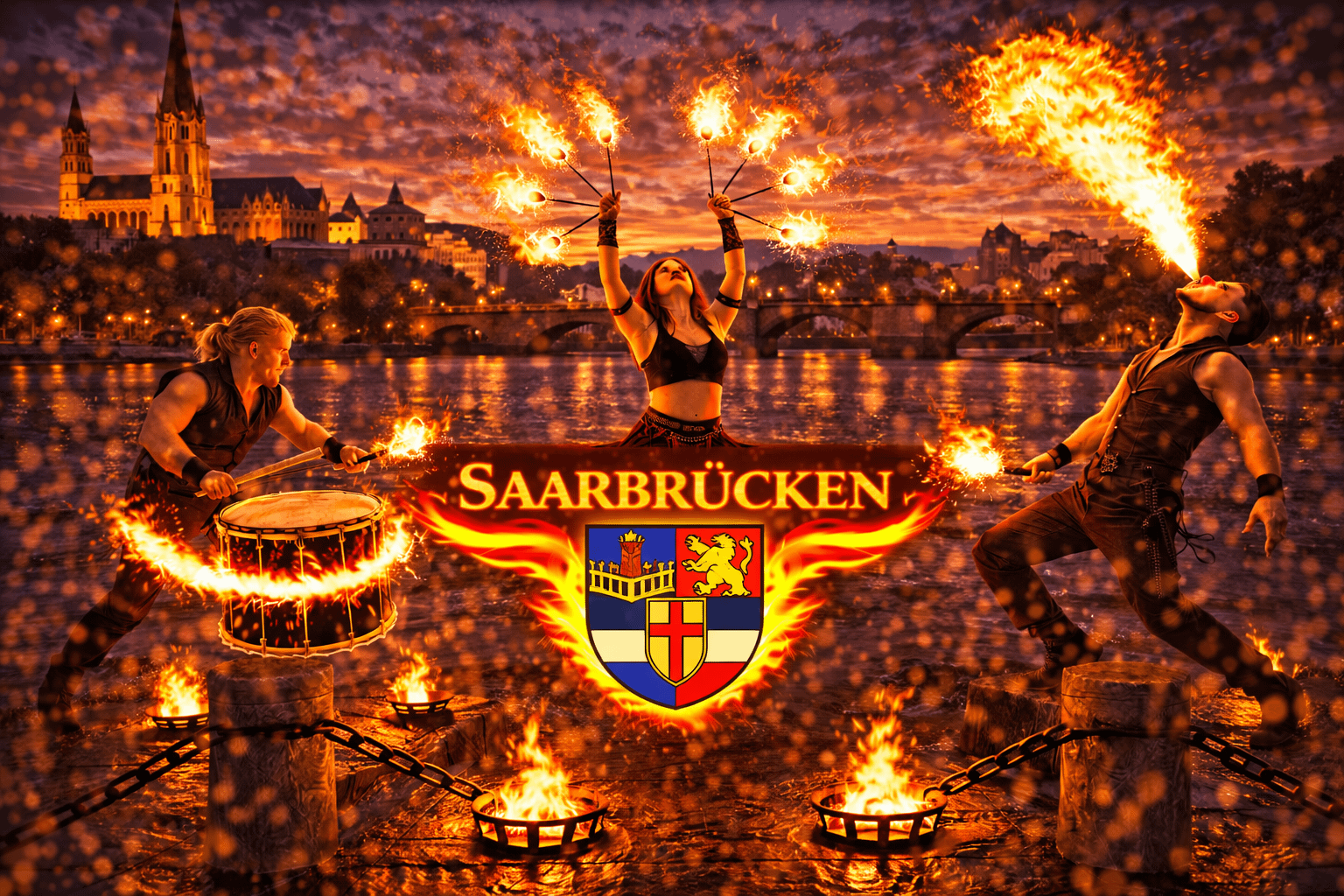 Saarbrücken ist die Landeshauptstadt des Saarlandes und zugleich das kulturelle und wirtschaftliche Zentrum der Region. Die Stadt liegt malerisch an der Saar und begeistert mit einer lebendigen Kulturszene, historischen Bauwerken und zahlreichen Veranstaltungsorten. Zwischen Altstadt, Saarpromenade und modernen Eventlocations finden jedes Jahr Hochzeiten, Firmenfeiern, Stadtfeste und private Veranstaltungen statt. Wenn Sie eine Feuershow in Saarbrücken buchen oder professionelle Feuerkünstler buchen in Saarbrücken möchten, sind Sie bei uns genau richtig.