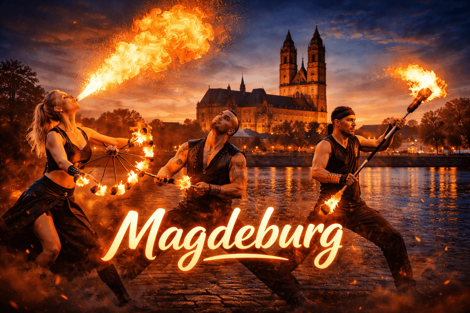 Magdeburg ist die Landeshauptstadt von Sachsen-Anhalt und gehört zu den wichtigsten kulturellen und wirtschaftlichen Zentren der Region. Die Stadt liegt direkt an der Elbe und bietet mit ihrer Mischung aus historischer Architektur, moderner Eventkultur und großen Veranstaltungsflächen ideale Voraussetzungen für außergewöhnliche Events. Zwischen Altstadt, Elbufer und zahlreichen Eventlocations finden jedes Jahr Hochzeiten, Firmenfeiern, Stadtfeste und private Veranstaltungen statt. Wenn Sie eine Feuershow in Magdeburg buchen oder professionelle Feuerkünstler buchen in Magdeburg möchten, sind Sie bei uns genau richtig.