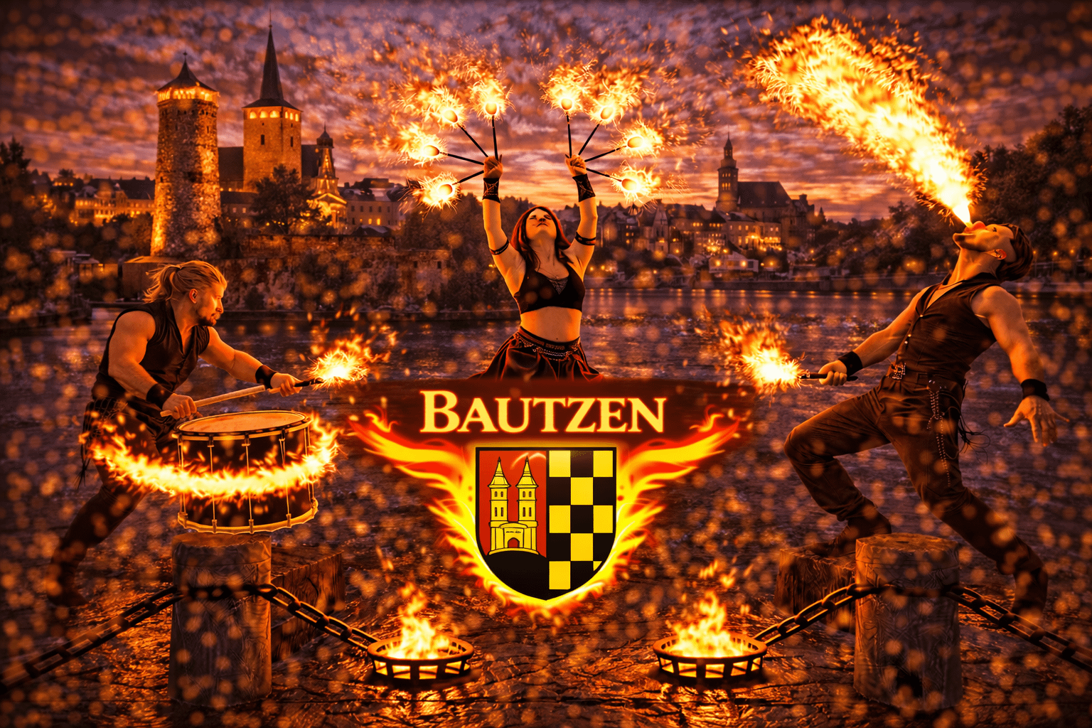 Bautzen gehört zu den schönsten historischen Städten Sachsens und ist besonders bekannt für seine beeindruckende Altstadt mit zahlreichen Türmen, mittelalterlichen Bauwerken und seiner Lage über der Spree. Die Stadt verbindet Geschichte, Kultur und moderne Veranstaltungsorte und bietet damit ideale Voraussetzungen für außergewöhnliche Events. Zwischen Altstadt, Ortenburg und verschiedenen Eventlocations finden regelmäßig Hochzeiten, Firmenfeiern, Stadtfeste und private Veranstaltungen statt. Wenn Sie eine Feuershow in Bautzen buchen oder professionelle Feuerkünstler buchen in Bautzen möchten, sind Sie bei uns genau richtig.