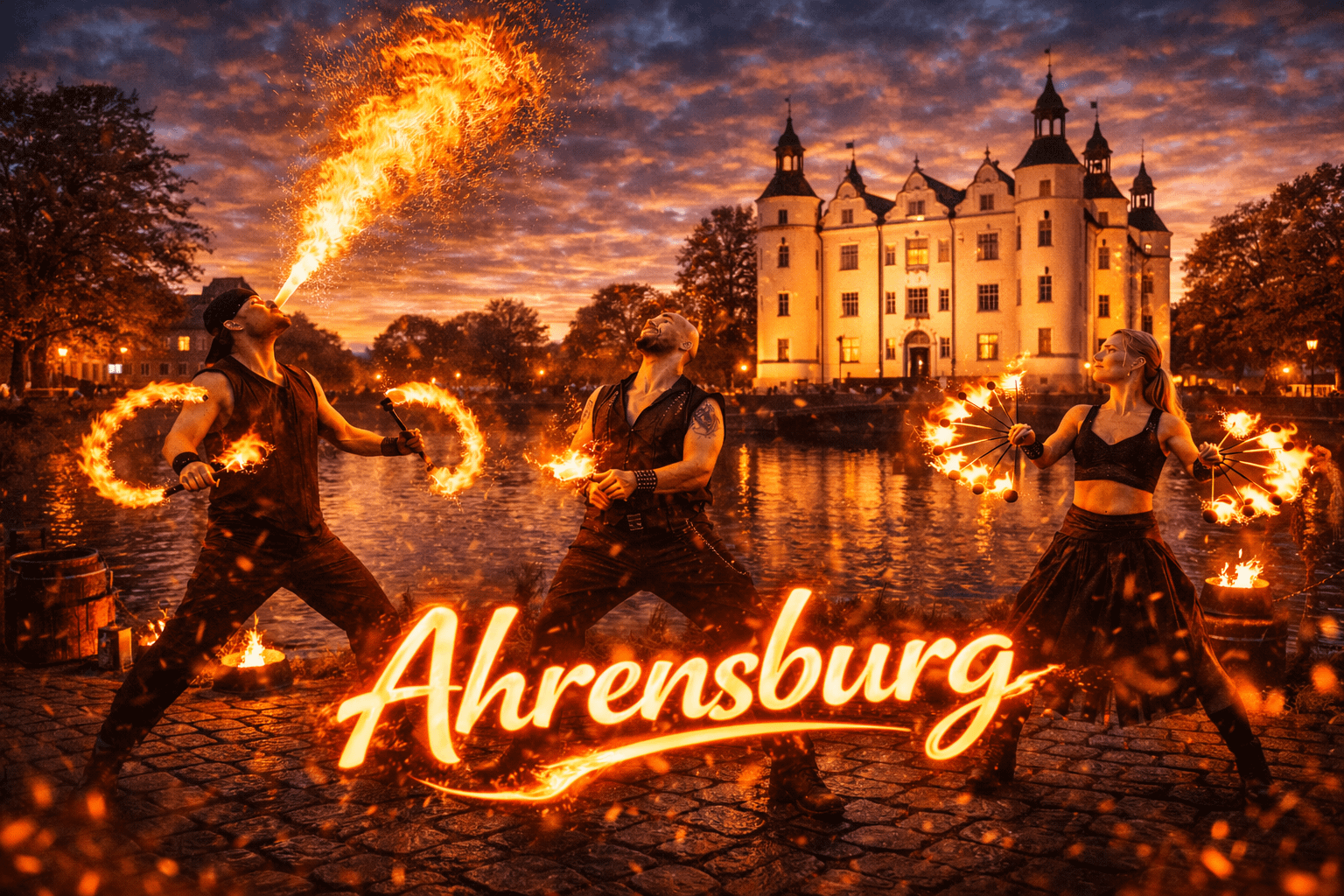 Ahrensburg gehört zu den schönsten Städten im Kreis Stormarn in Schleswig-Holstein und liegt nur wenige Kilometer nordöstlich von Hamburg. Besonders bekannt ist die Stadt für das beeindruckende Schloss Ahrensburg, den weitläufigen Schlosspark und zahlreiche kulturelle Veranstaltungen. Durch die Nähe zur Metropole Hamburg finden hier regelmäßig Hochzeiten, Firmenveranstaltungen, Stadtfeste und private Events statt. Wenn Sie eine Feuershow in Ahrensburg buchen oder professionelle Feuerkünstler buchen in Ahrensburg möchten, sind Sie bei uns genau richtig.