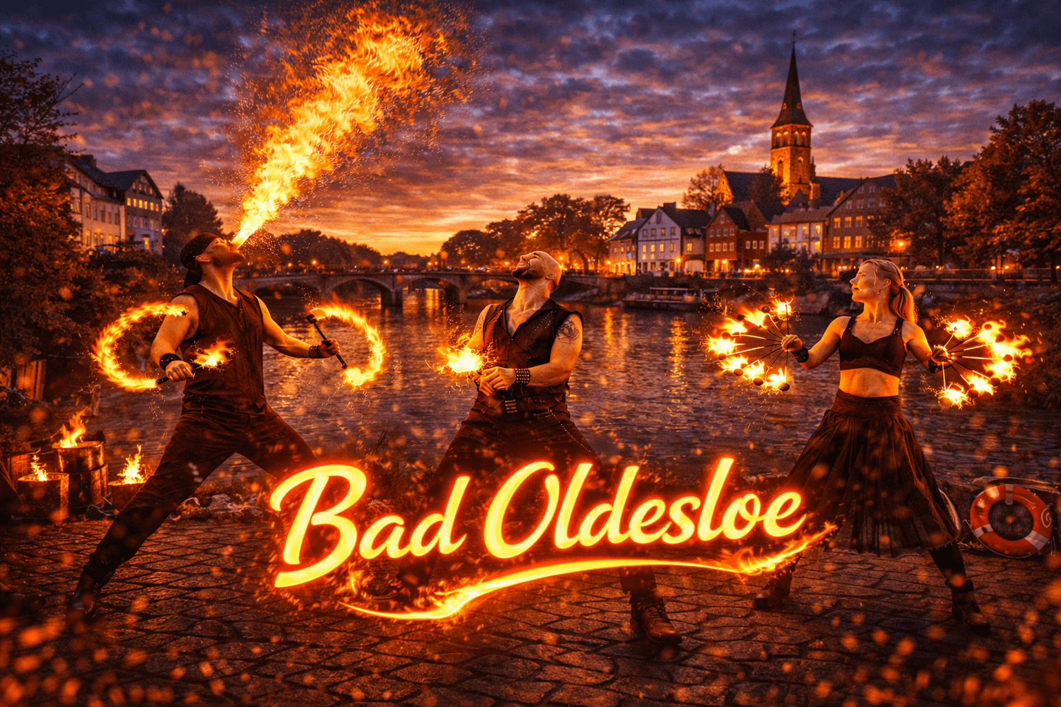 Bad Oldesloe ist die Kreisstadt des Kreises Stormarn in Schleswig-Holstein und liegt zentral zwischen Hamburg und Lübeck. Die Stadt ist bekannt für ihre historische Altstadt, den Kurpark sowie die Flusslandschaft von Trave und Beste. Durch diese besondere Lage und die zahlreichen Veranstaltungsorte finden hier regelmäßig Hochzeiten, Firmenfeiern, Stadtfeste und private Events statt. Wenn Sie eine Feuershow in Bad Oldesloe buchen oder professionelle Feuerkünstler buchen in Bad Oldesloe möchten, sind Sie bei uns genau richtig.