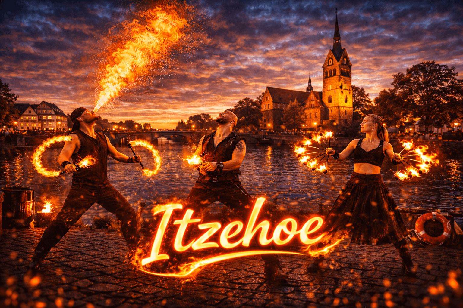 Itzehoe gehört zu den wichtigsten Städten im Kreis Steinburg in Schleswig-Holstein und blickt auf eine lange Geschichte zurück. Die Stadt liegt malerisch an der Stör und bietet mit ihrer historischen Innenstadt, modernen Veranstaltungsorten und zahlreichen Events ideale Voraussetzungen für außergewöhnliche Veranstaltungen. Zwischen Altstadt, Störufer und verschiedenen Eventlocations finden regelmäßig Hochzeiten, Firmenfeiern, Stadtfeste und private Events statt. Wenn Sie eine Feuershow in Itzehoe buchen oder professionelle Feuerkünstler buchen in Itzehoe möchten, sind Sie bei uns genau richtig.