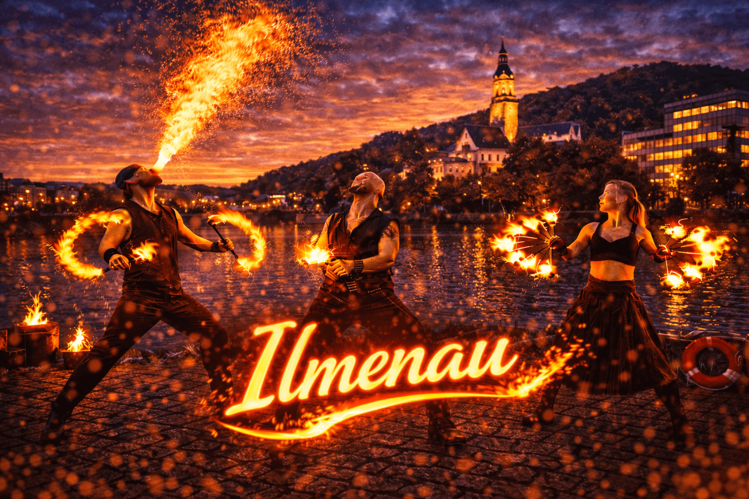 Ilmenau liegt malerisch am Nordrand des Thüringer Waldes und gehört zu den bekanntesten Städten im Süden Thüringens. Die Stadt verbindet eine lebendige Universitätskultur mit wunderschöner Natur und einer charmanten Altstadt. Besonders durch die Technische Universität Ilmenau sowie zahlreiche Veranstaltungen in der Region finden hier regelmäßig Hochzeiten, Firmenveranstaltungen, Stadtfeste und private Feiern statt. Wenn Sie eine Feuershow in Ilmenau buchen oder professionelle Feuerkünstler buchen in Ilmenau möchten, sind Sie bei uns genau richtig.